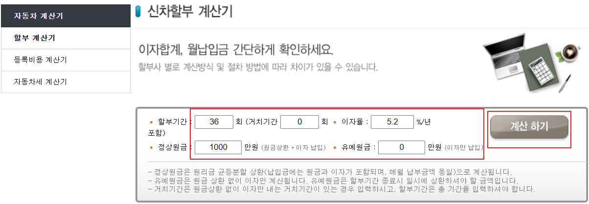 2.할부 기간, 이자율, 정상 원금 및 유예 원금을 입력하고 계산하기를 누르면 끝입니다. 할부 계산기와 더불어 등록비용 계산기, 자동차세 계산기 등도 알아보실수 있습니다.
