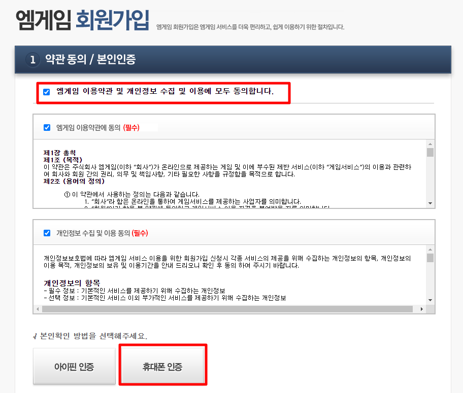 엠게임 로그인을 하기위해서 회원가입을 진행합니다.우선 홈페이지에 있는 약관및 정보수집에 모두동의합니다를 체크하신후 휴대폰인증을 시작합니다