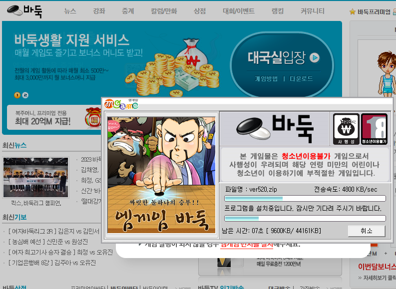 대국실 입장버튼을 누르면 엠게임 바둑 런처가 설치되며 금방 끝나니 조금만 기다려주세요
